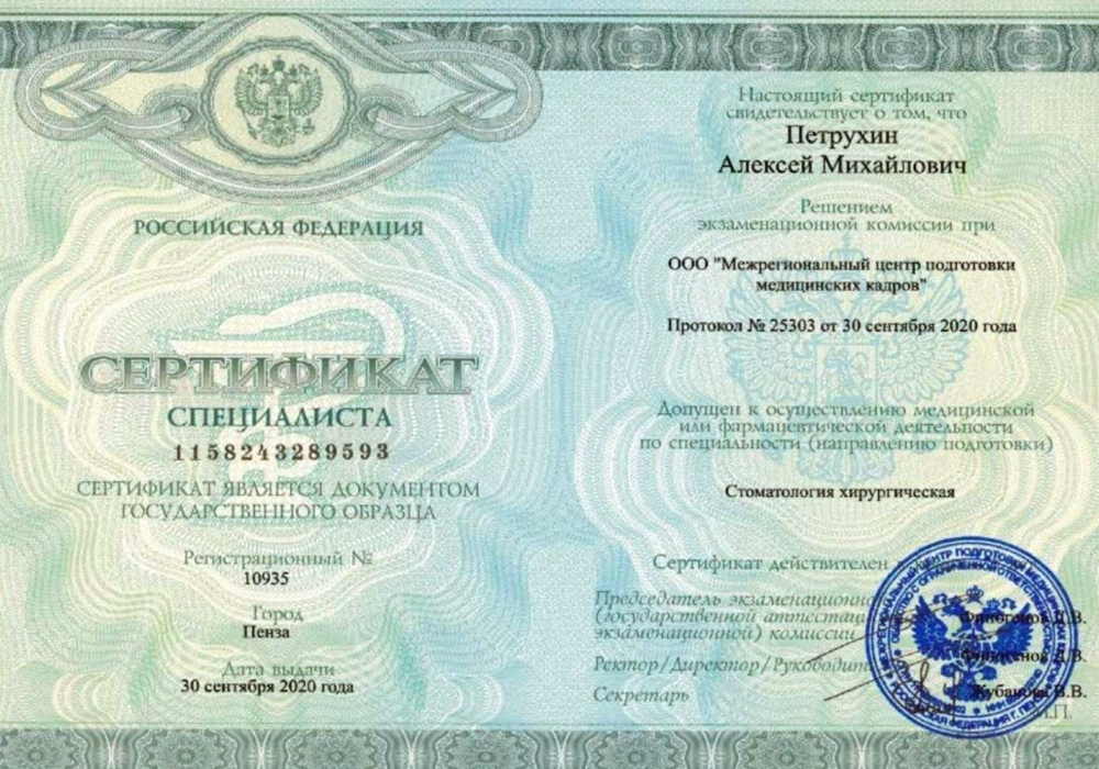 2020 г. - Повышение квалификации в Межрегиональном центре подготовки медицинских кадров по специальности «Стоматология хирургическая».