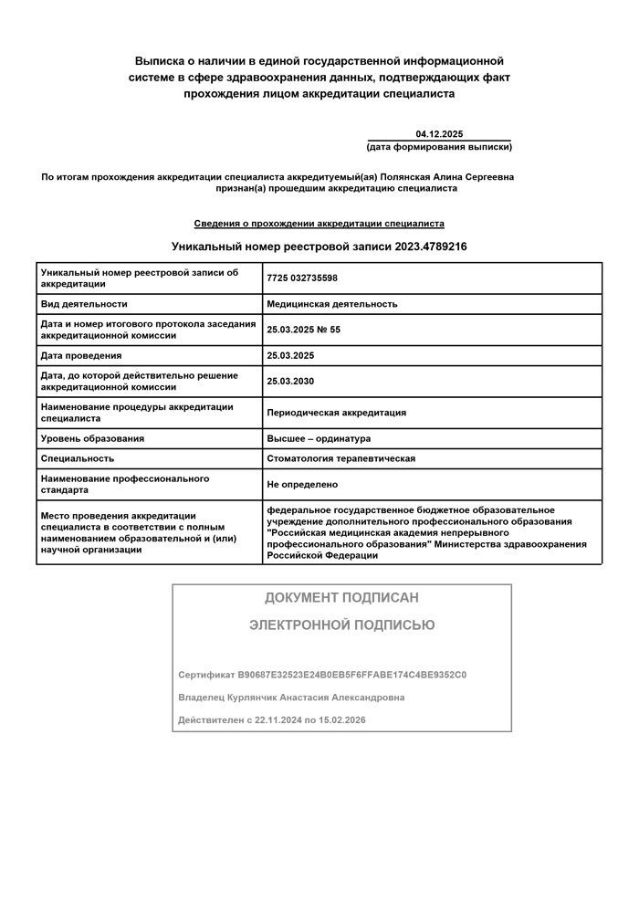2025 г. - Повышение квалификации на базе Российской медицинской академии непрерывного профессионального образования по специальности «Стоматология терапевтическая».