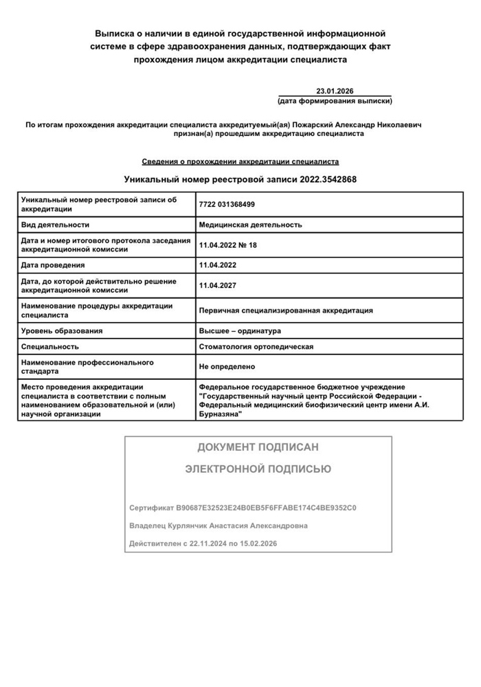 2022 г. - Профессиональная переподготовка в Федеральном медицинском биофизическом центре им.А.И.Бурназяна по специальности «Стоматология ортопедическая».