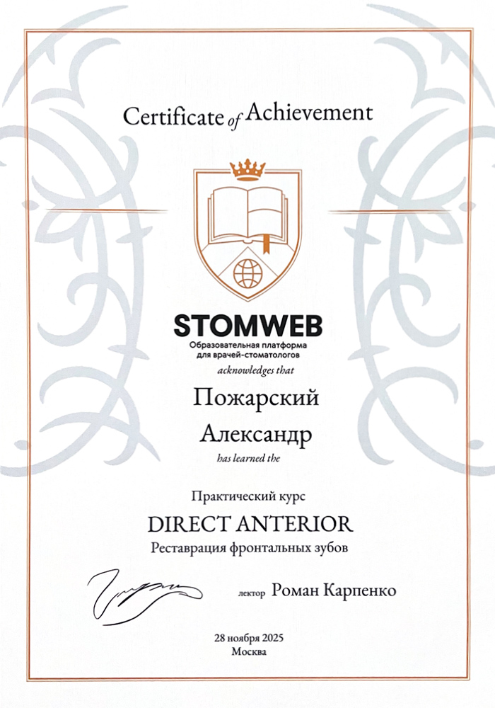 2018 г. - Окончил Московский государственный медико-стоматологический университет им.А.И. Евдокимова по специальности «Стоматология».
