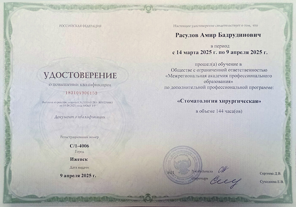 2025 г. - Повышение квалификации в Межрегиональной академии профессионального образования по специальности «Стоматология хирургическая».