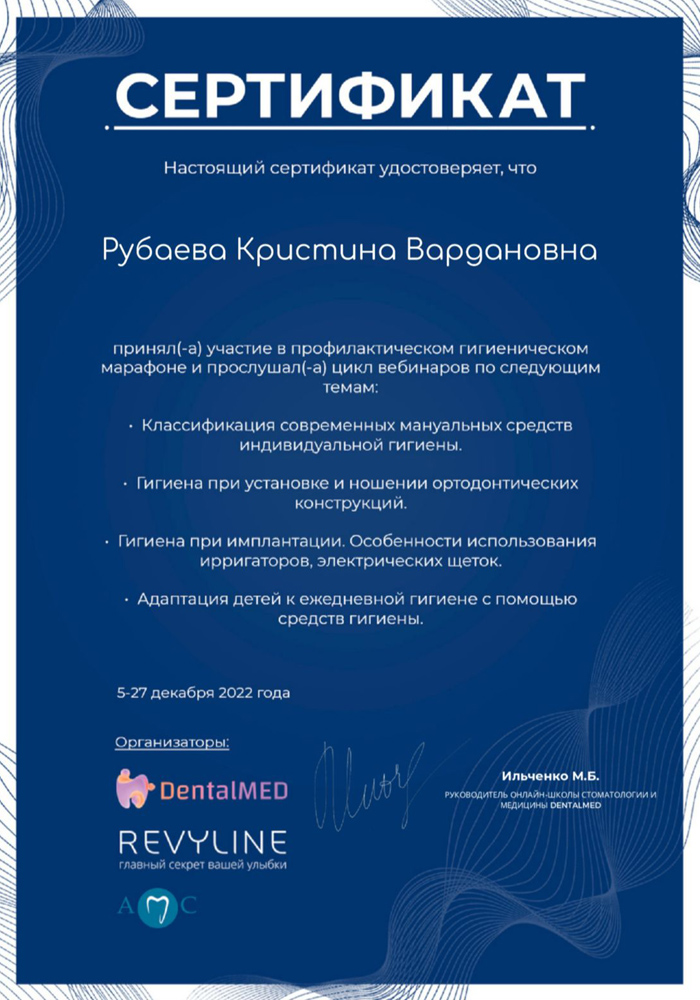2022 г. - «Классификация современных мануальных средств индивидуальной гигиены. Гигиена при установке и ношении ортодонтических конструкций. Гигиена при имплантации. Особенности использования ирригаторов, электрических щеток. Адаптация детей к ежедневной гигиене с помощью средств гигиены».