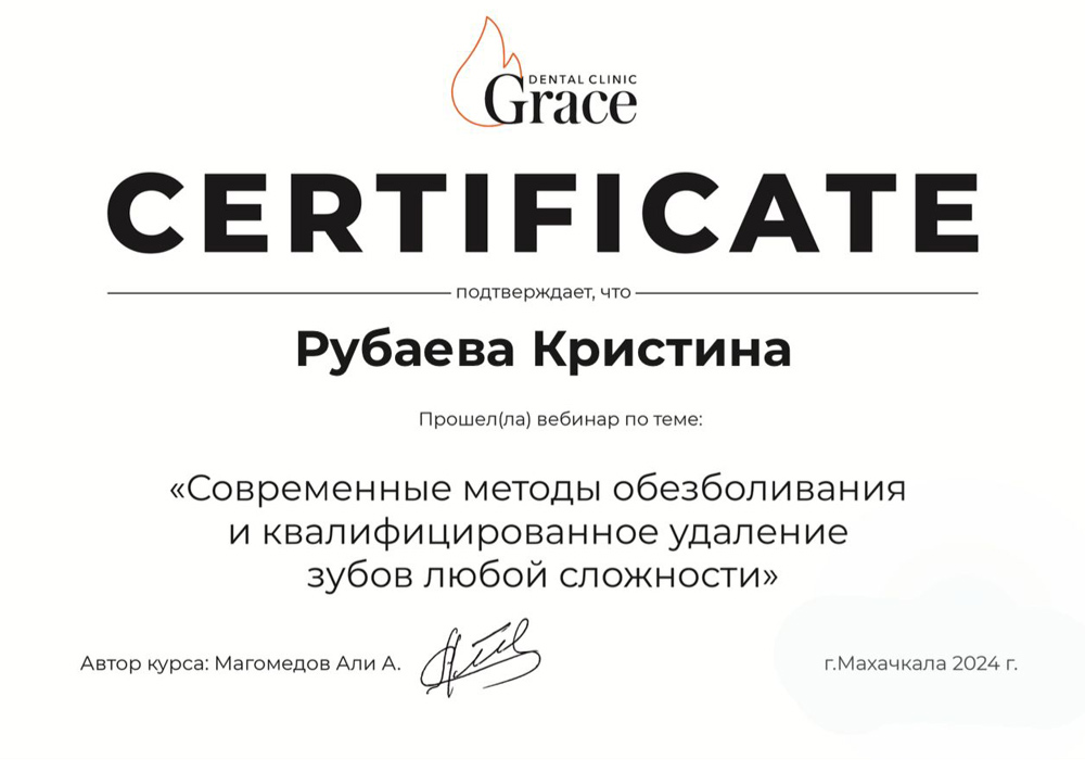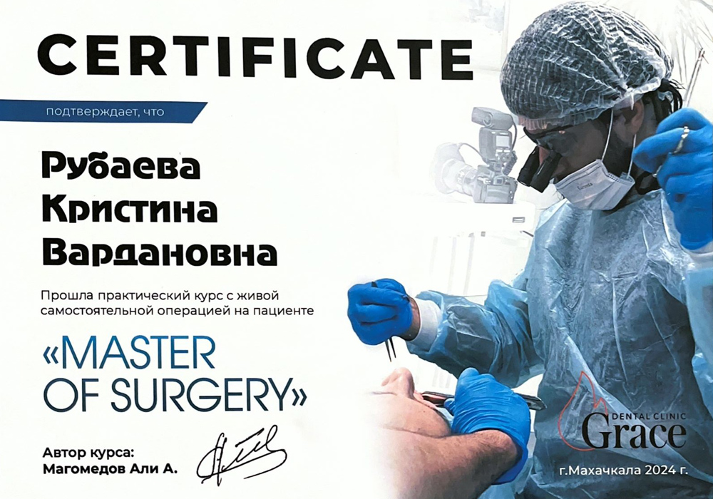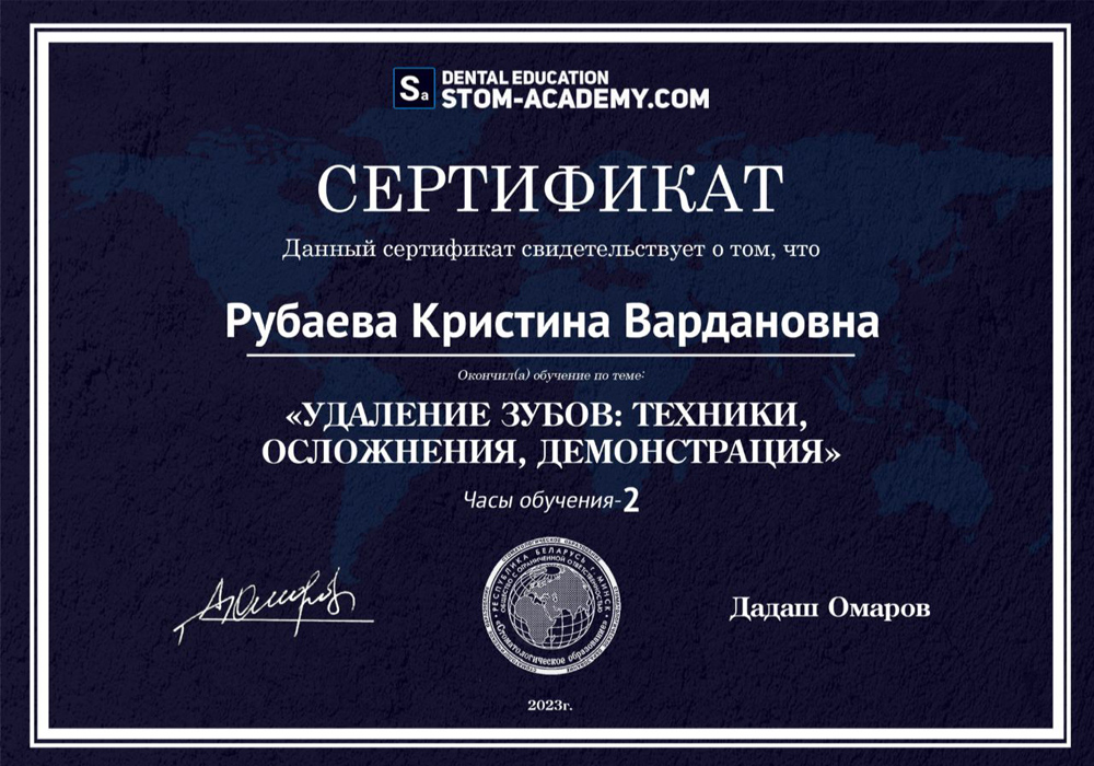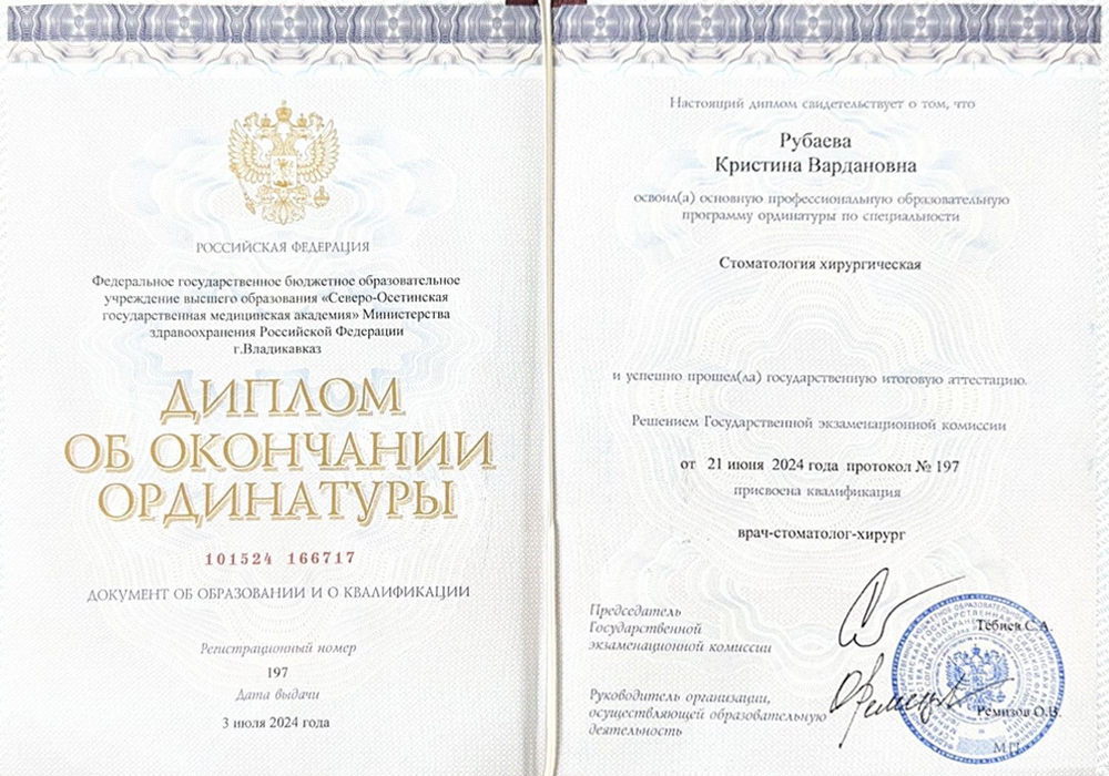 2024 г. - Ординатура в Северо-Осетинской государственной медицинской академии по специальности «Стоматология хирургическая».