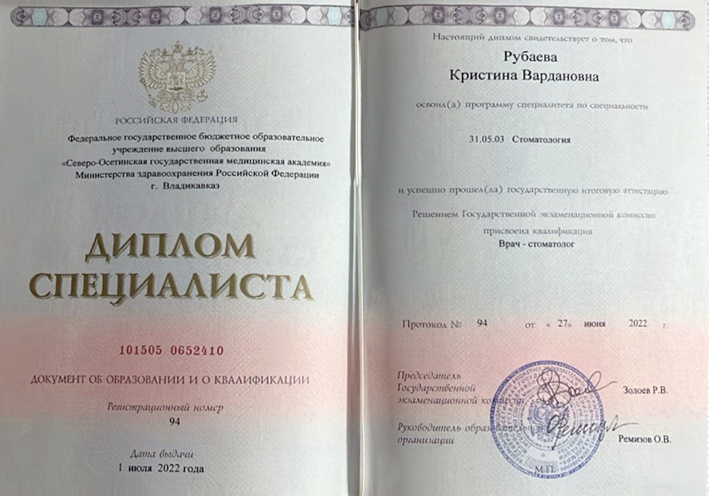 2022 г. - Окончила Северо-Осетинскую государственную медицинскую академию по специальности «Стоматология».