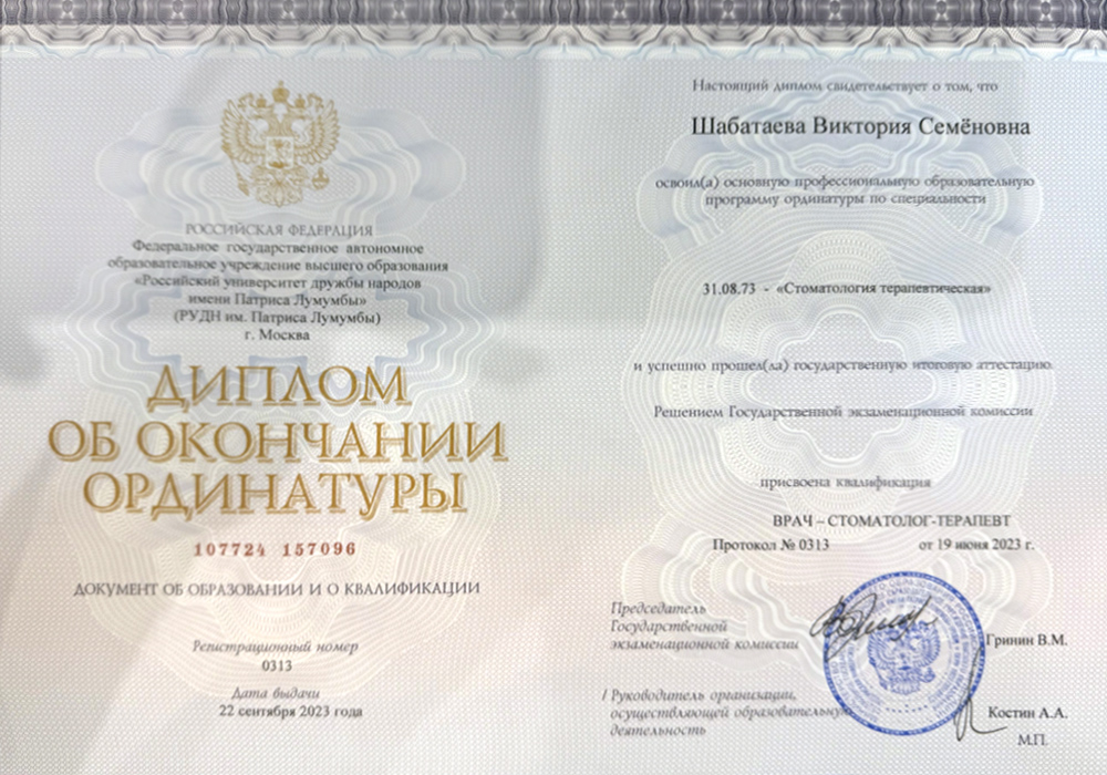 2023 г. - Ординатура в Российском университете дружбы народов имени Патриса Лумумбы по специальности «Стоматология терапевтическая».
