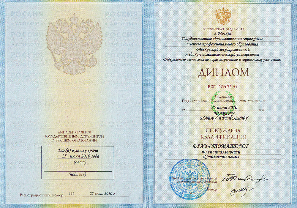 2010 г. - Окончил Московский государственный медико-стоматологический университет по специальности «Стоматология».