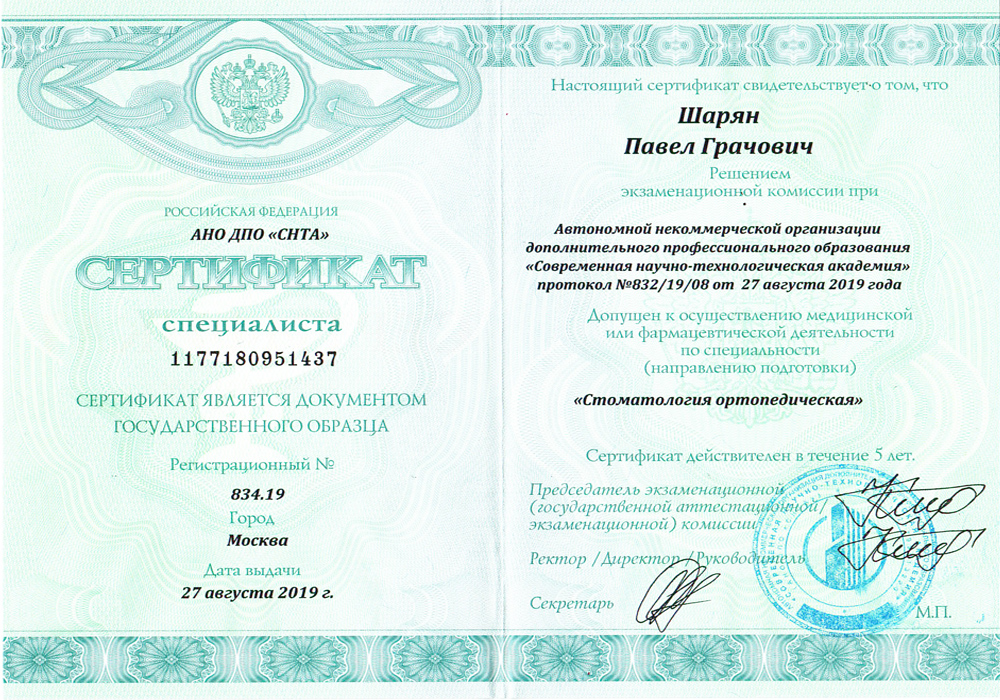 2019 г. - Повышение квалификации в Современной научно-технологической академии по специальности «Стоматология ортопедическая».
