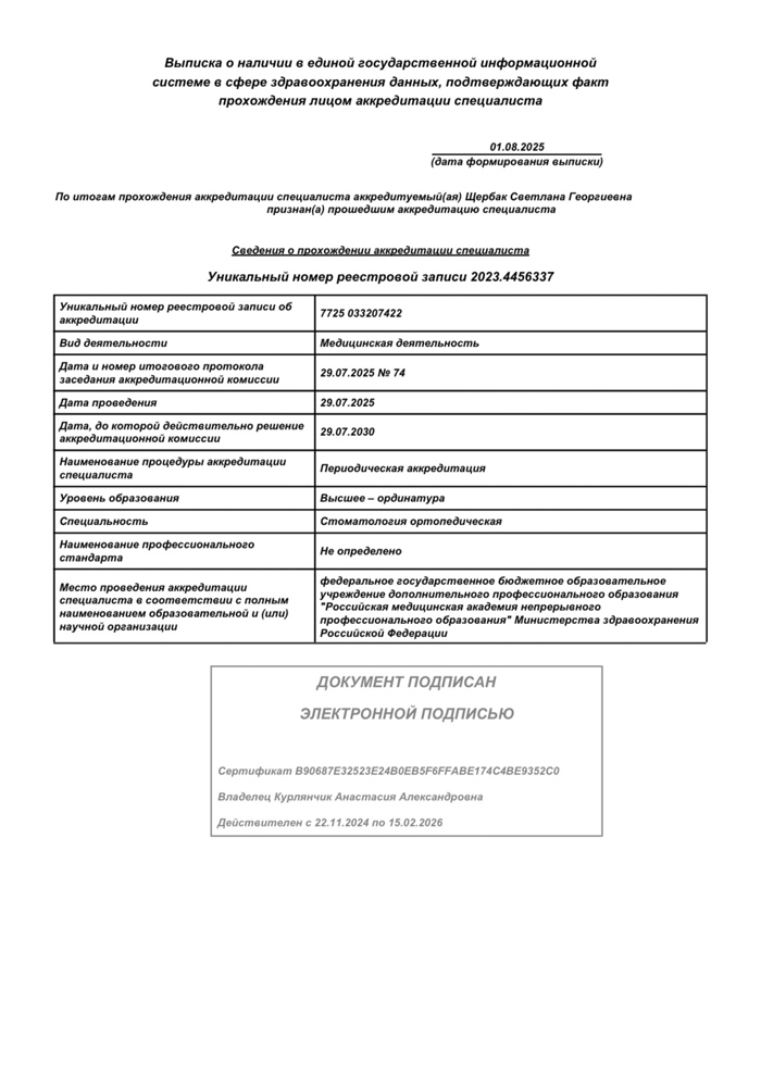 2025 г. - Повышение квалификации в Российской медицинской академии непрерывного профессионального образования по специальности «Стоматология ортопедическая».