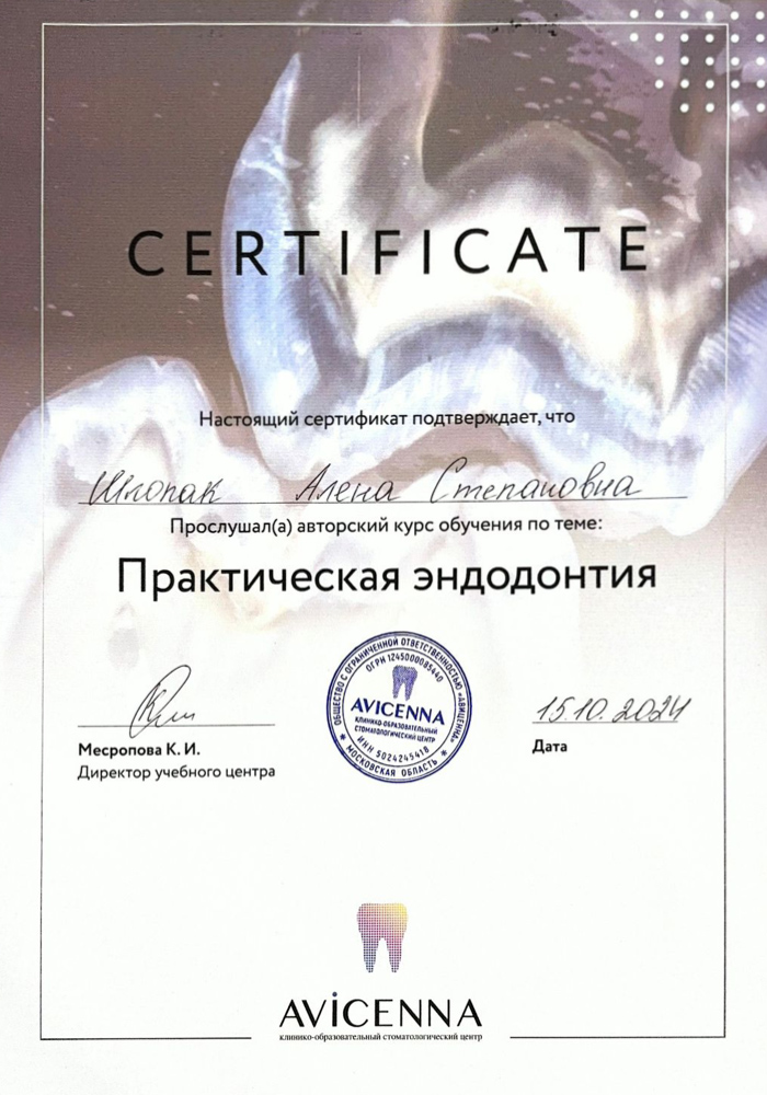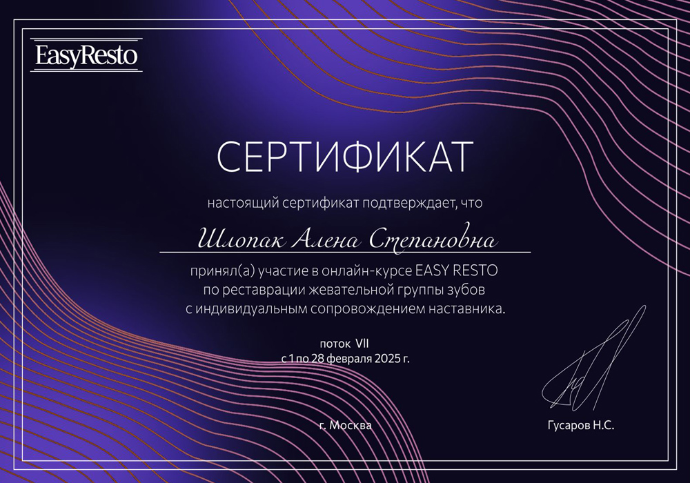2024 г. - Ординатура в Центральной государственной медицинской академии по специальности «Стоматология ортопедическая».