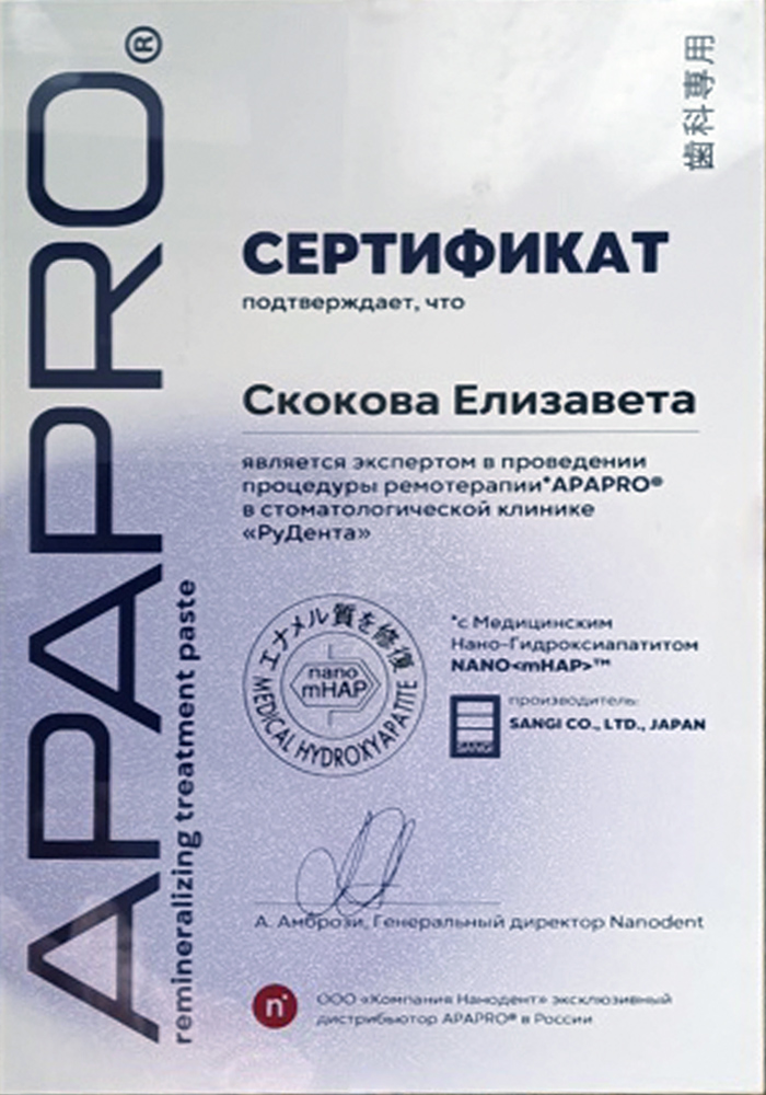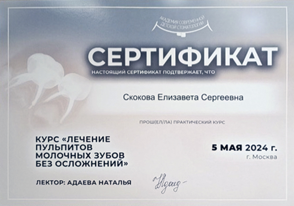 2024 г. - Профессиональная переподготовка в Российском университете дружбы народов по специальности «Стоматология детская».