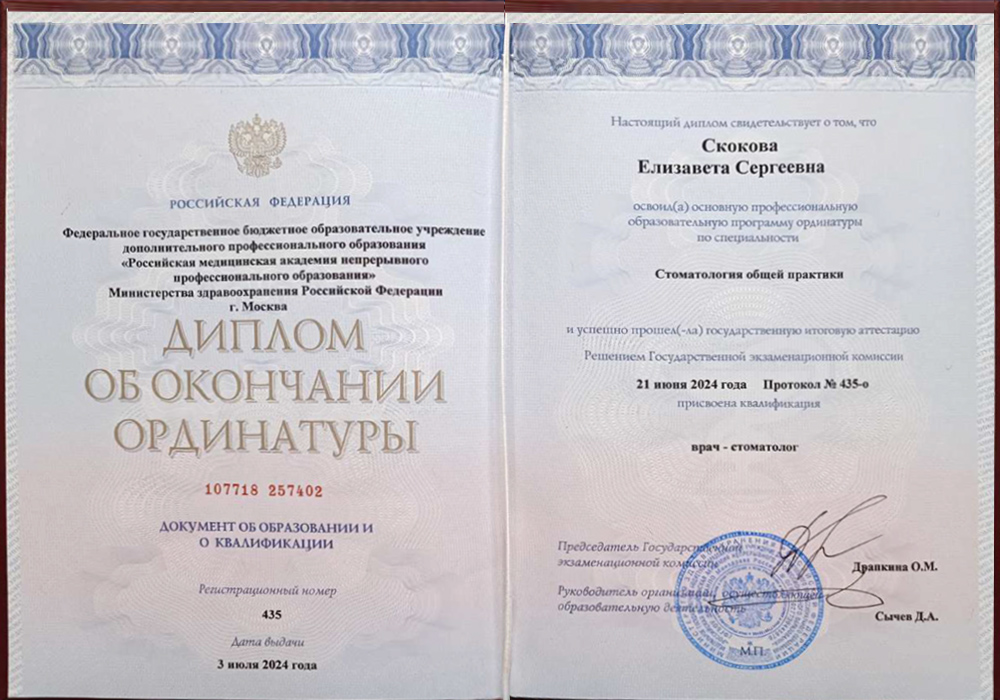 2024 г. - Ординатура в Российской медицинской академии непрерывного профессионального образования по специальности «Стоматология общей практики».