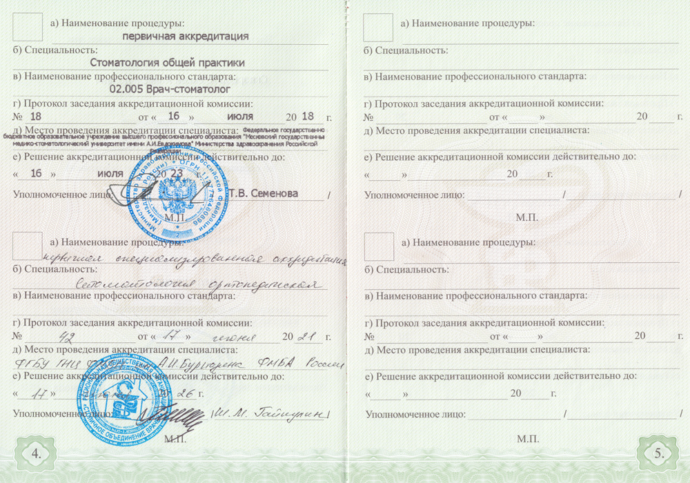 2020 г. - Ординатура в Федеральном медицинском биофизическом центре им.А.И Бурназяна по специальности «Стоматология ортопедическая».