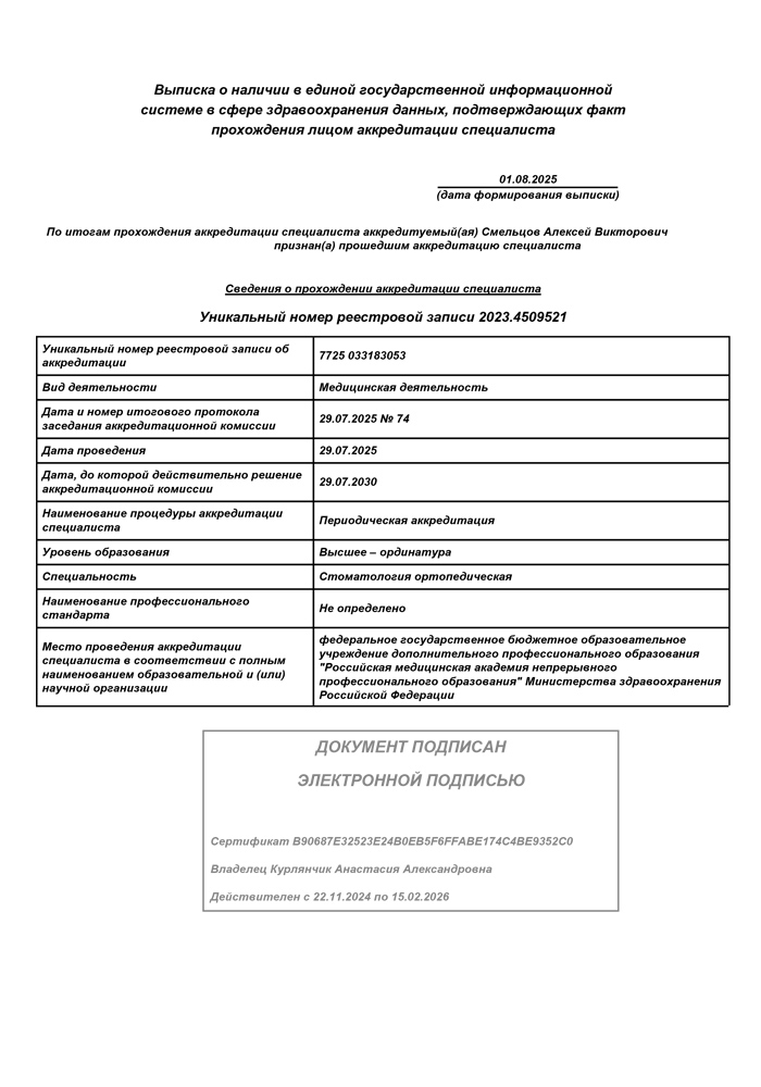 2025 г. - Повышение квалификации в Российской медицинской академии непрерывного профессионального образования по специальности «Стоматология ортопедическая».