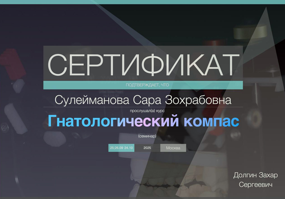 2024 г. - Ординатура в Российском университете дружбы народов по специальности «Ортодонтия».