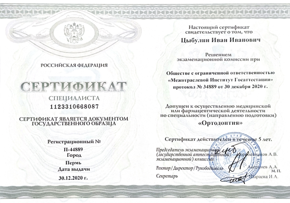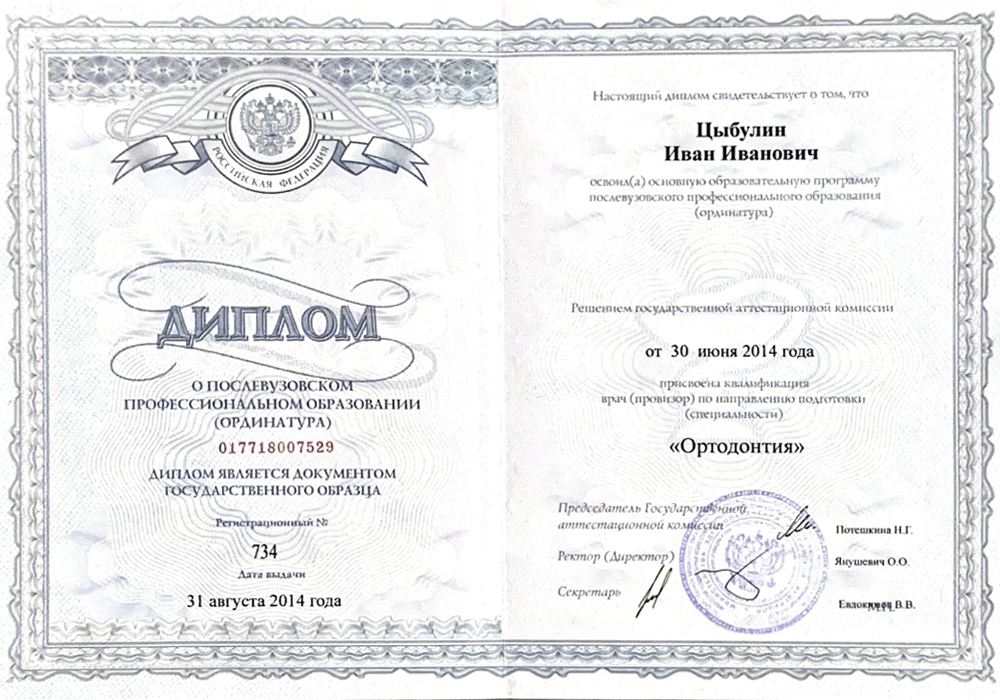 2014 г. - Ординатура в Московском государственном медико-стоматологическом университете им.А.И.Евдокимова по специальности «Ортодонтия».