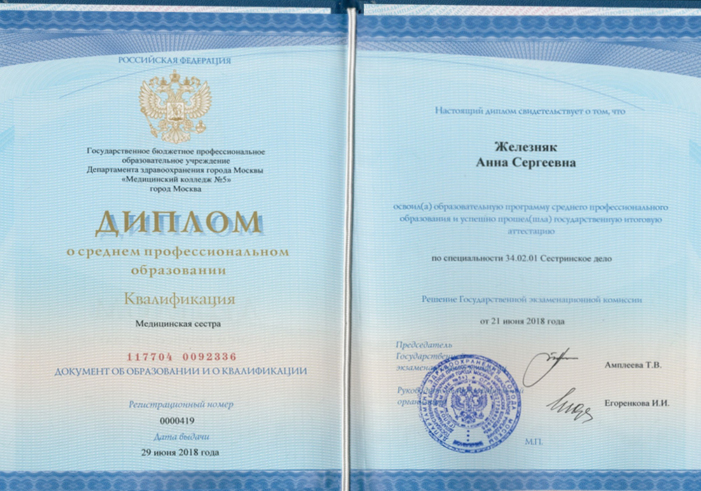 2018 г. - Окончила Медицинский колледж №5 по специальности «Сестринское дело».