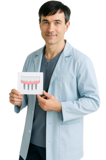 - Если конструкция устанавливается на искусственные корни, стоматолог проводит вживление имплантов. После процесса остеоинтеграции (4-6 месяцев) врач приступит к протезированию.