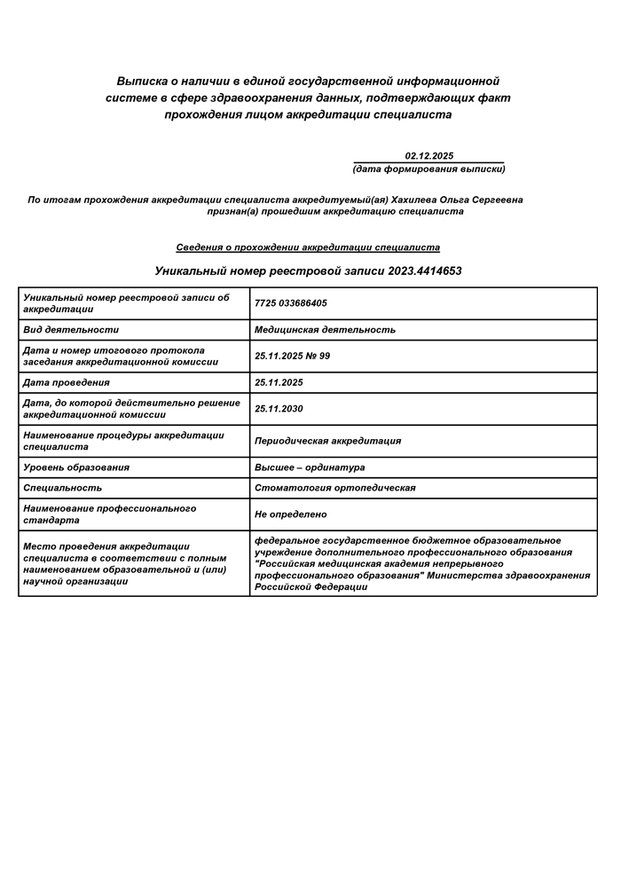 2020 г. - Повышение квалификации в Сибирском институте непрерывного медицинского образования по специальностям «Стоматология общей практики», «Стоматология терапевтическая» и «Стоматология ортопедическая».