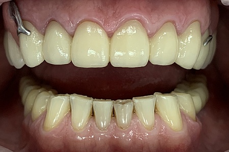 - Последний этап – фиксация E-max. Керамическая коронка закрепляется на импланте с помощью абатмента, на обточенном зубе - с использованием стоматологического цемента.