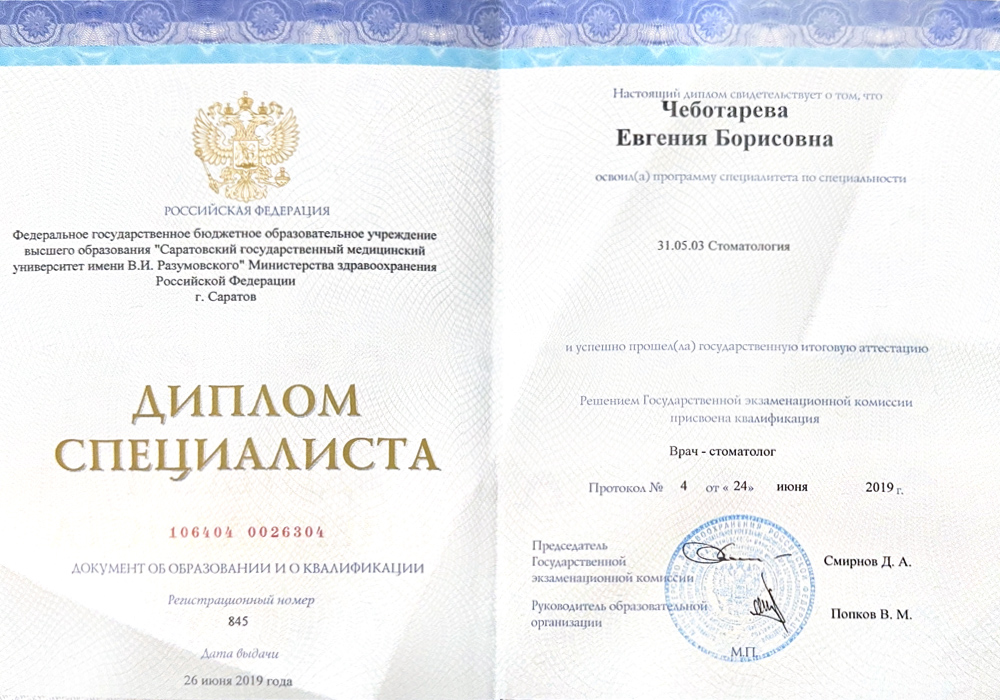 2019 г. - Окончила Саратовский государственный медицинский университет им.В.И.Разумовского по специальности «Стоматология».