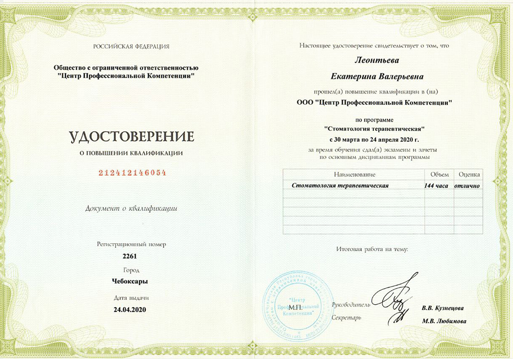2020 г. - Повышение квалификации в Центре профессиональной компетенции по специальности «Стоматология терапевтическая».