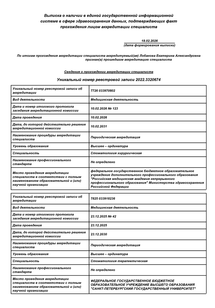 2026 г. - Повышение квалификации в Санкт-Петербургском государственном университете по специальности «Стоматология терапевтическая».