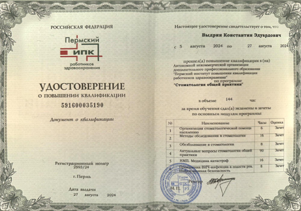 2024 г. - Повышение квалификации в Пермском институте повышения квалификации работников здравоохранения по специальности «Стоматология общей практики».