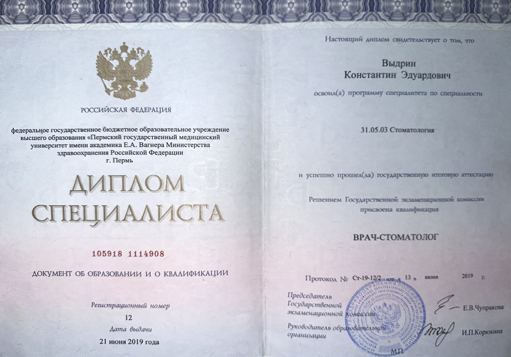 2019 г. - Окончил Пермский государственный медицинский университет им.ак.Е.А.Вагнера по специальности «Стоматология».