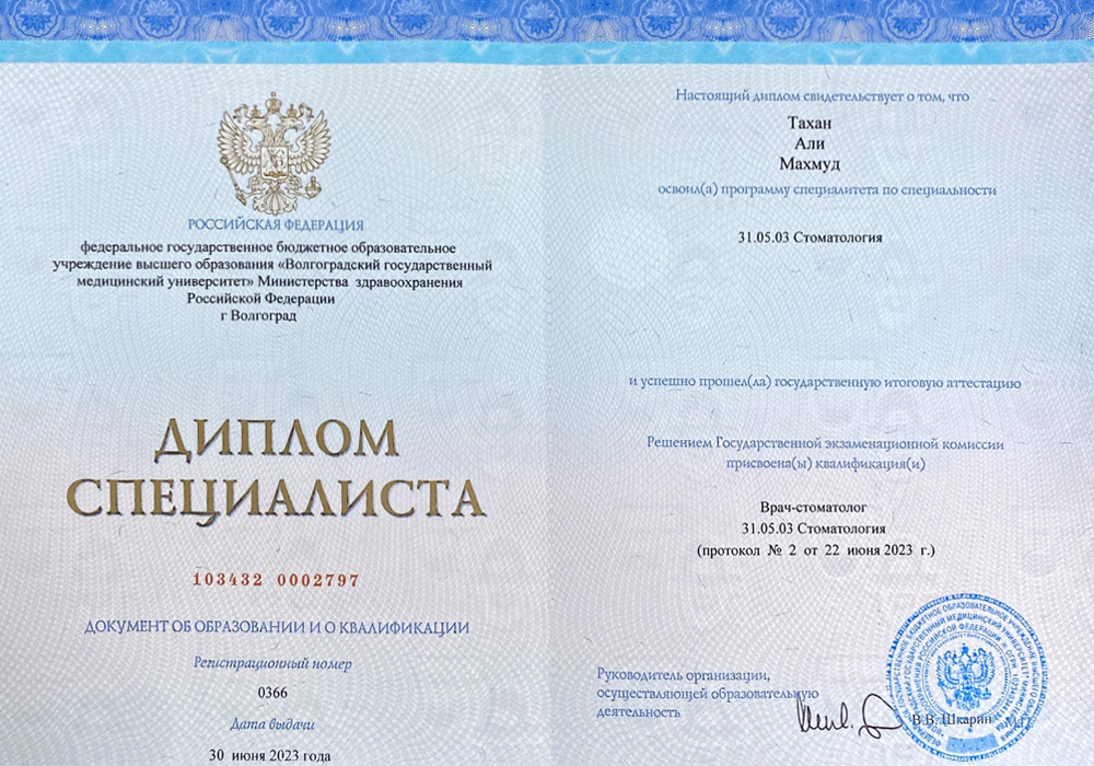 2023 г. - Окончил Волгоградский государственный медицинский университет по специальности «Стоматология».