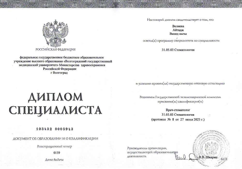 2025 г. - Окончила Волгоградский государственный медицинский университет по специальности «Cтоматология».